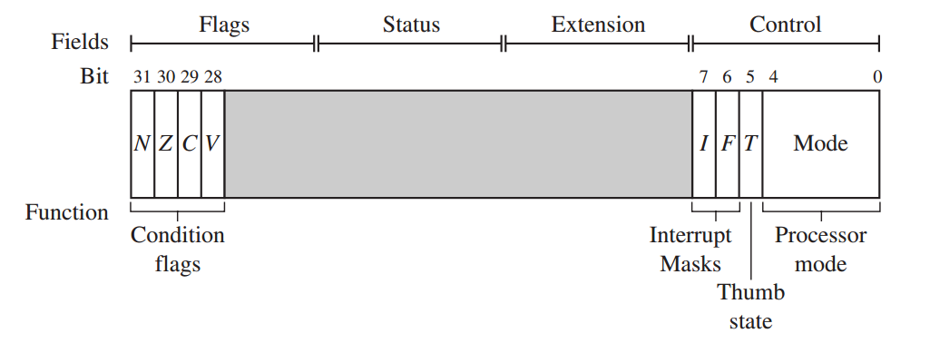 참고) A Saved Program Status Register (SPSR) stores the current value of the CPSR when an exception is taken so that the CPSR can be restored after handling the exception. Each exception handling mode can access its own SPSR. User mode and System mode do not have an SPSR because they are not exception handling modes. (www.keil.com/support/man/docs/armasm/armasm_dom1359731139484.htm)