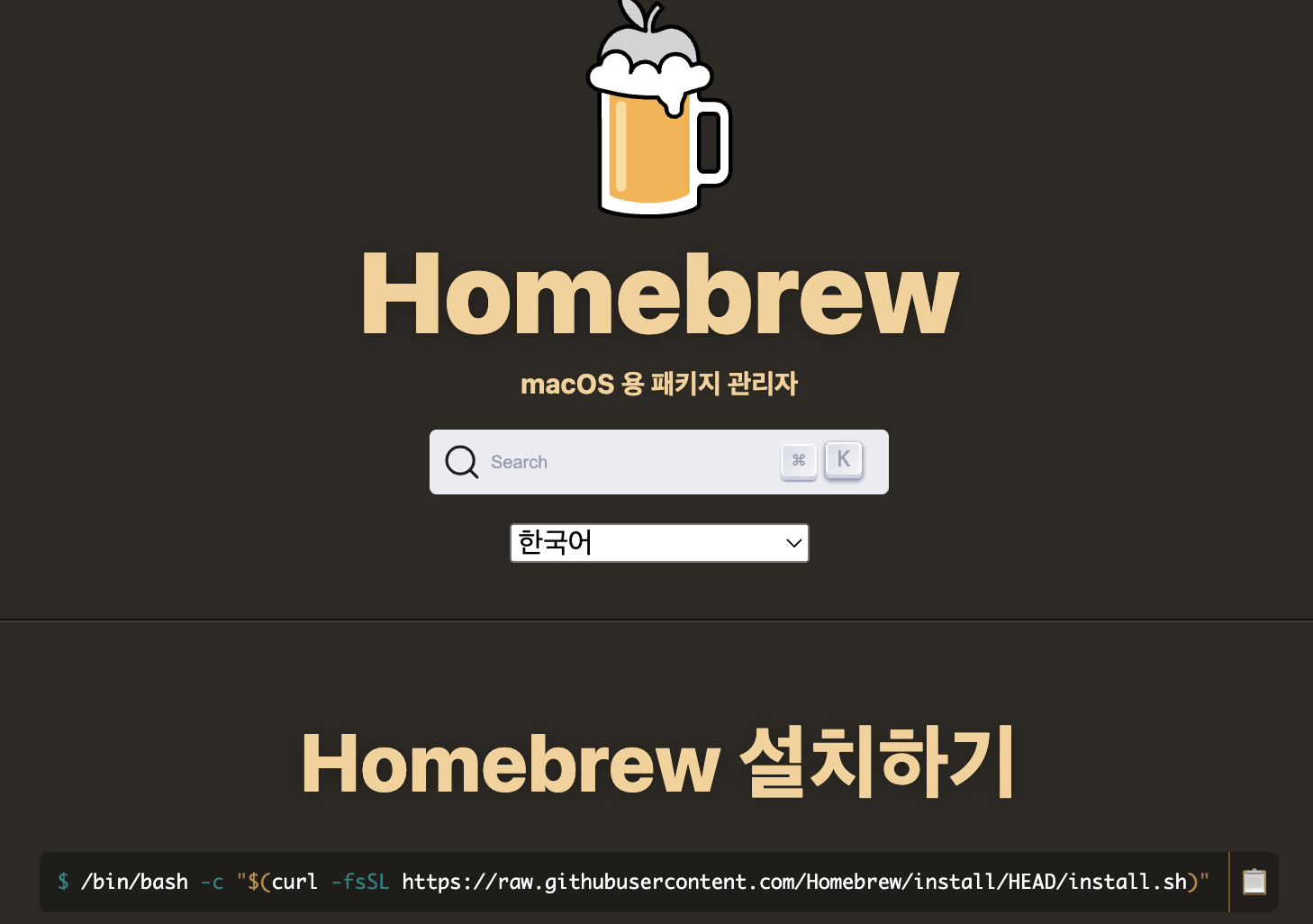 1. Homebrew 사이트에 접속하여 (설치하고자 하는 언어 선택 후) install command를 복사한다.